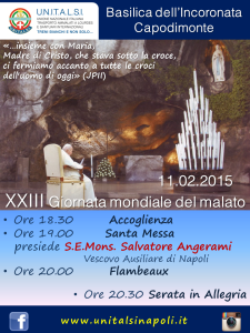 6. Affido questa Giornata Mondiale del Malato alla protezione materna di Maria, che ha accolto nel grembo e generato la Sapienza incarnata, Gesù Cristo, nostro Signore. O Maria, Sede della Sapienza, intercedi quale nostra Madre per tutti i malati e per coloro che se ne prendono cura. Fa’ che, nel servizio al prossimo sofferente e attraverso la stessa esperienza del dolore, possiamo accogliere e far crescere in noi la vera sapienza del cuore. Accompagno questa supplica per tutti voi con la mia Benedizione Apostolica.